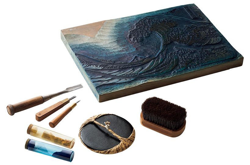 主な彫道具(ほりどうぐ)と摺道具(すりどうぐ)。職人は一人前になるまでに「彫師7年、摺師5年」といわれ、道具を使いこなすにも長い時間と修業が必要だ。