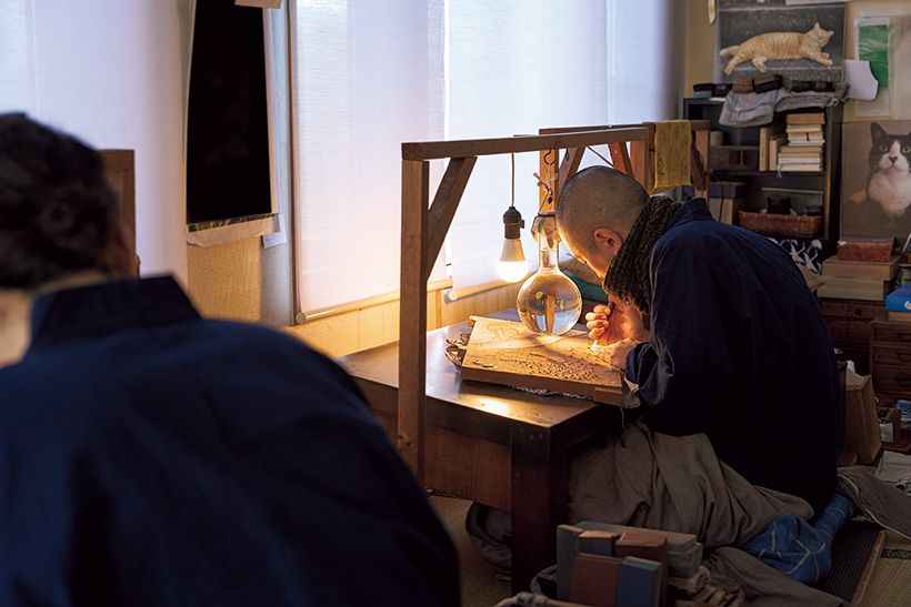 【彫】江戸時代と同じ山桜の版木を彫る「彫師」。水が入ったフラスコは、光を反射させ、刃先の影を消すためのもの。