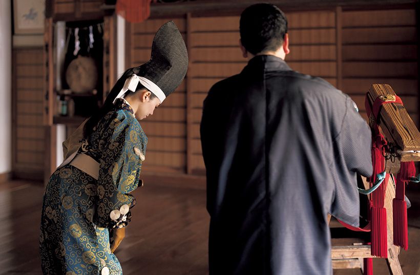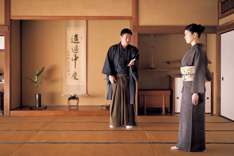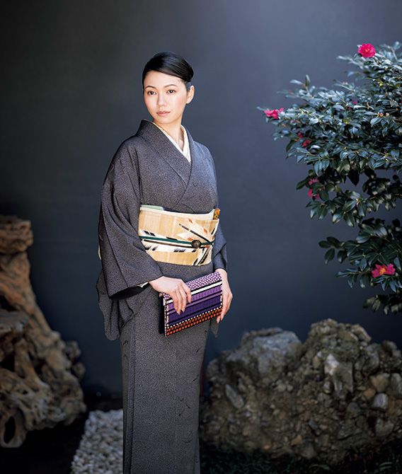二階堂さんが締めているのは、昭和初期のアンティークの帯。兜の刺繡が入ったお太鼓柄で、季節感と武家の礼節を習う気持ちを表現した。床の間に飾られた兜の香炉とも響き合う。