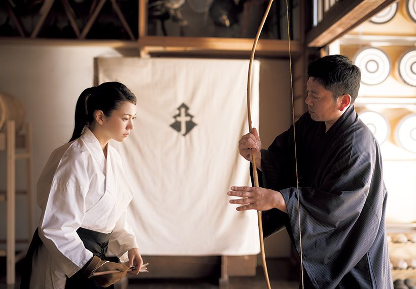 弓道の胴着に着替え、弓や矢の持ち方、角度など、細かく指導を受ける。すべてが筋肉の働きを自然に使うための理にかなったこと。