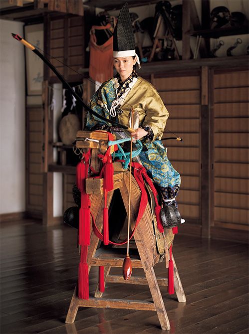 鎌倉の鶴岡八幡宮をはじめ、全国約10か所で流鏑馬(やぶさめ)神事を務める小笠原家。通常は木馬で稽古をするといいます。二階堂さんも装束を身につけ、体験することに。