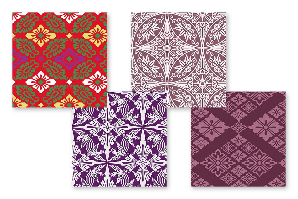 選・文=八條忠基(「綺陽装束研究所」主宰)王朝貴族は子孫の繁栄を何よりも望みました。全面に拡がり果てしなき連続性のある文様は「いつまでも続く繁栄」を想起させるものとして、吉祥柄とされ愛されたのです。代表的な連続文には「唐草」「襷」などがあります。