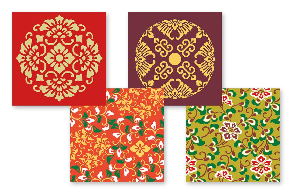 その根源は正倉院宝物であることが多く、遙か西域の夢の国を想起させるエキゾチックな文様がルーツです。それが平安時代中期の国風文化の隆盛とともに和様化し、千年の歴史の流れの中で洗練されて「臥蝶丸(ふせちょうのまる)」のような代表的有職文様が生まれたのです。