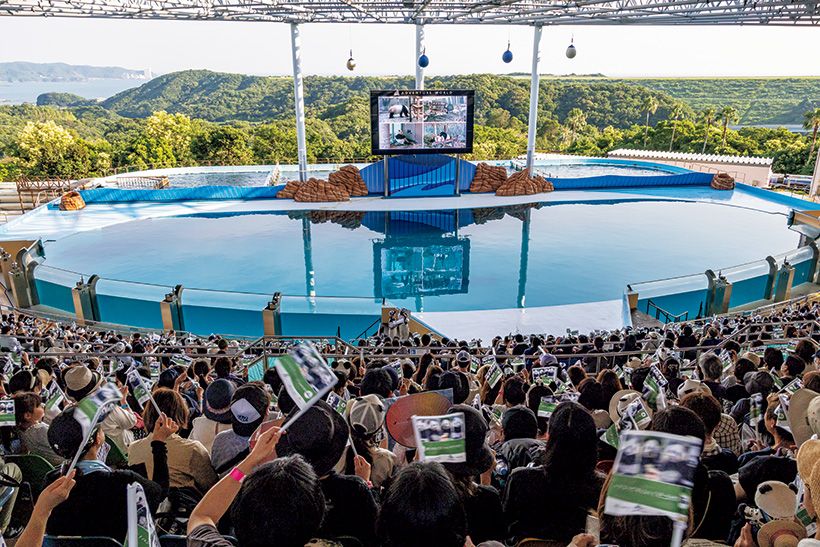 ビッグオーシャンでのセレモニーの様子。4頭が暮らすパンダラブ、ブリーディングセンターを中継で繫ぐと歓声が上がった。