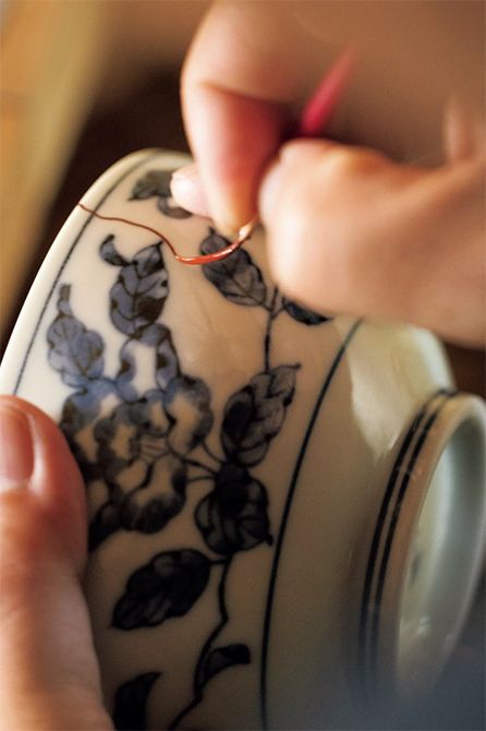 上写真の前の工程。ひび割れに漆を浸透させて接着した後、仕上げに漆で線を描く。器は、二階堂さんの手持ちのもの。