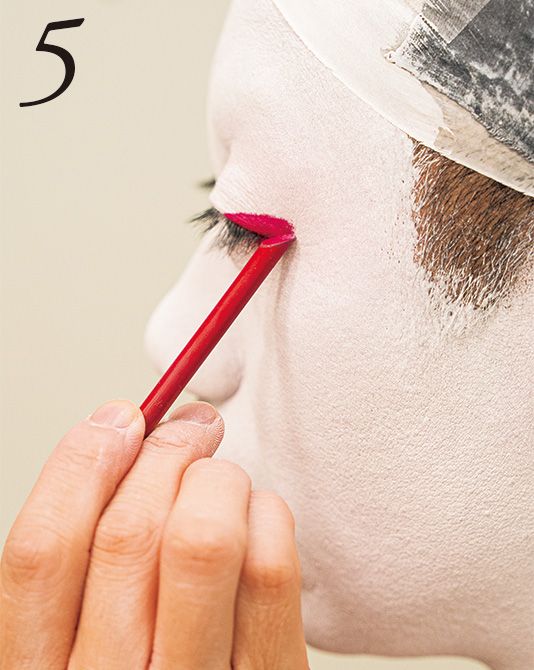 5.紅を筆につけ、目張りを入れる。