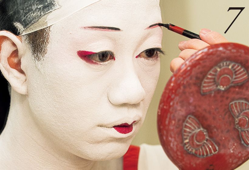 「化粧は、子どもの頃は祖父のお弟子さんにしていただいており、自分ですべてするようになったのは僕の場合は遅いほうで中学3年生くらいの時でした。化粧の工程で最も大切なのは、目張りを入れる、口紅を差す、眉毛を引く、この3つの工程だと思います。女方の鬘(かつら)や衣裳は重く、特に『助六由縁江戸桜(すけろくゆかりのえどざくら)』の揚巻などの役は約30キロもあるそうです。また『京鹿子娘道成寺(きょうかのこむすめどうじょうじ)』のように、何枚もの衣裳を重ねて着て、引き抜きで変化を見せる演目にもご注目いただきたいですね」