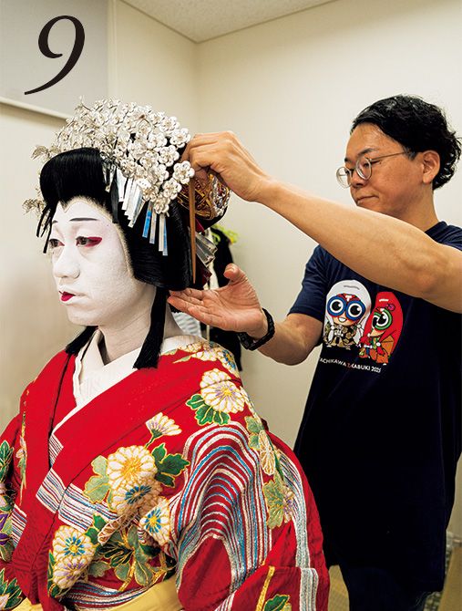9.床山さんが鬘をかぶせる。