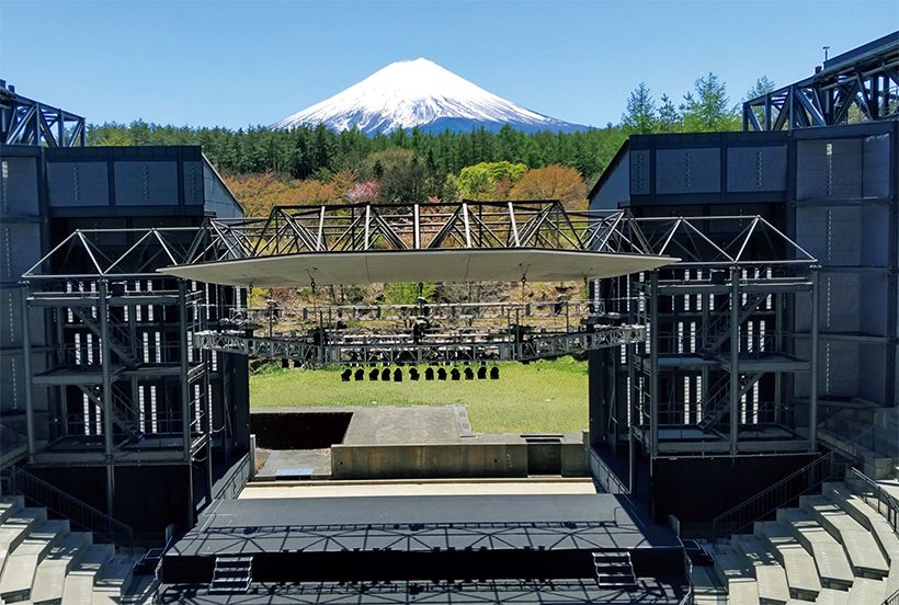 音響反射板(可動ステージ)の向こうには緑の芝生や森、そして富士山の山頂部が見える
