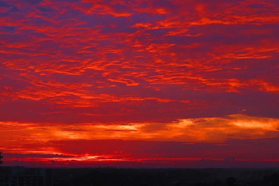高い空に雲が広がっているときなどは、雲が真っ赤に焼けるだけでなく、周囲の景色までもが焼け色に包まれ、息をのむほど美しい光景が広がります。