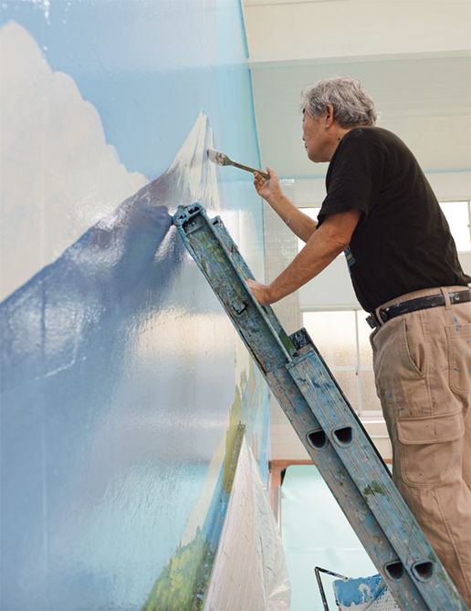 東京都足立区の「おきもと湯」では、1967年の開業以来約3年に一度描き替えを行い、ほぼすべて中島さんが担当。前の絵の上から直接描くので、ペンキの厚みが増していきます。朝から始め、夕方には3階相当の高さの壁に見事な富士山が完成しました。