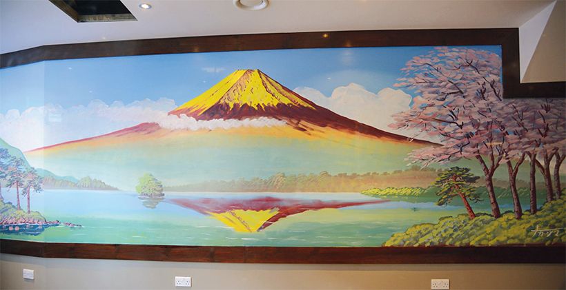 富士山以外は想像上の景色。前の絵は左側に富士山を描いたため、右側の女湯から「私たちも近くで見たい」と要望が。今回はしっかり真ん中に。