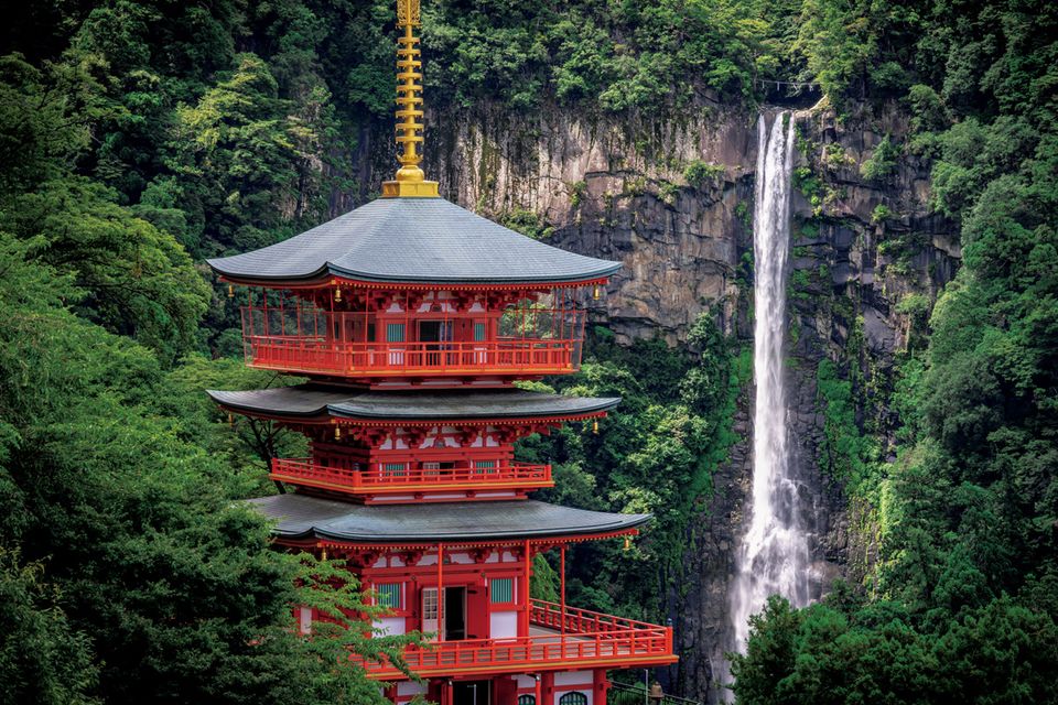 那智の大滝を背に美しい佇まいを見せる青岸渡寺の三重塔。平安時代末期に建立された歴史ある宝塔である(現在の建物は再建)。