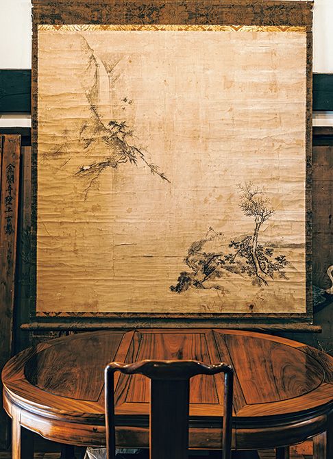 かつて金閣寺の床の間の壁を彩ったとされる絵が、掛軸に仕立てられている。