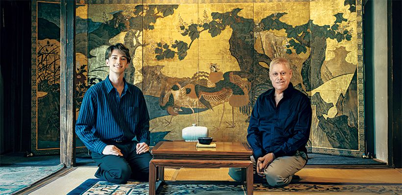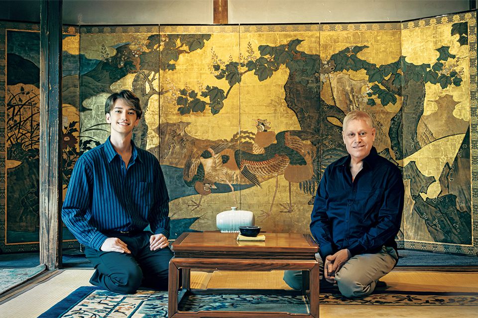 「光あるバレエダンサーのために」と、アレックスさんが吟味した屛風の前で。力強くてとびきりゴージャス。絢爛豪華な屛風は、桃山時代から江戸初期の作と伝えられる。
