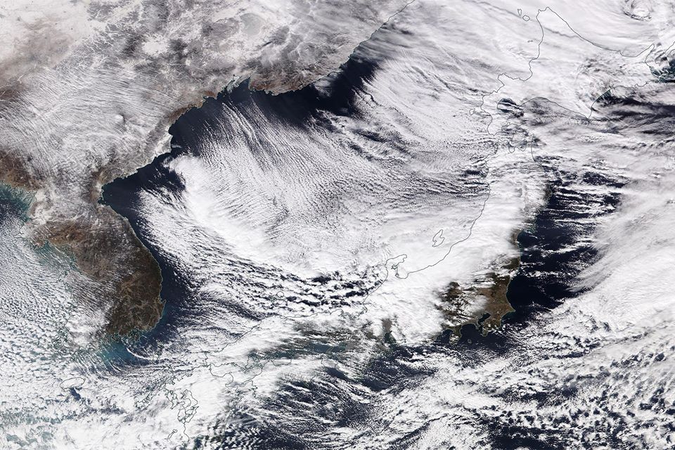 筋状雲」と呼ばれる雲です。大陸から吹き出した寒気は、温かい日本海で熱と水蒸気を補給されて、暖かく湿った空気に変わります。この空気が上昇することでできた