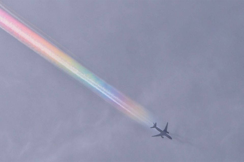 ふと空を見上げたとき、まっすぐに伸びる飛行機雲が目に入ることがあります。よく見ると、飛行機のすぐ後ろにできた雲が虹色に輝いて見えることがあるのをご存じでしょうか。
