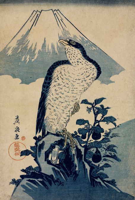初夢に見ると縁起のよいものとして、江戸時代に流布したのが「一富士二鷹三茄子」の語句で、浮世絵でもしばしば主題となっている。堂々とした様子で岩上に佇む鷹を中心に、背景に富士、傍らに茄子が描かれている。くちばしや足には黄色が摺られているが、基本的には藍摺絵の一種といえる。