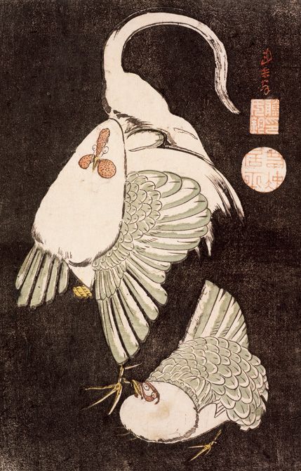 「雌雄鶏図」伊藤若冲 木版彩色摺 江戸時代(1603-1868)