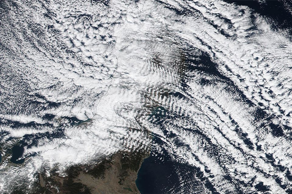 冬になると、気象衛星画像では、東北地方の太平洋側に南北にのびる規則正しい縞模様が現れることがあります。この雲は「波状雲」と呼ばれます。
