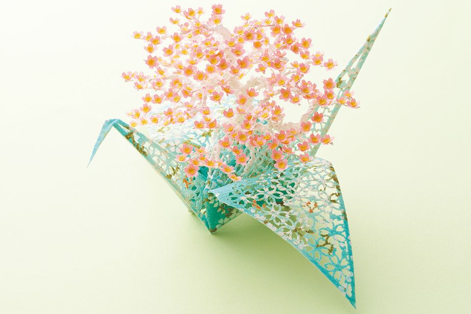 こちらは「盆栽折り鶴」という、「盆栽」と「折り鶴」を掛け合わせたオリジナルの作品です。約300の桜の花が咲いています。そして、その桜の木を背負うのは「京友禅の生地」で制作した折り鶴。羽根には桜柄の切り絵を、背中には七宝紋様の切り絵を施しました。切り絵をした際にほつれない様、生地には特殊な加工をしています。