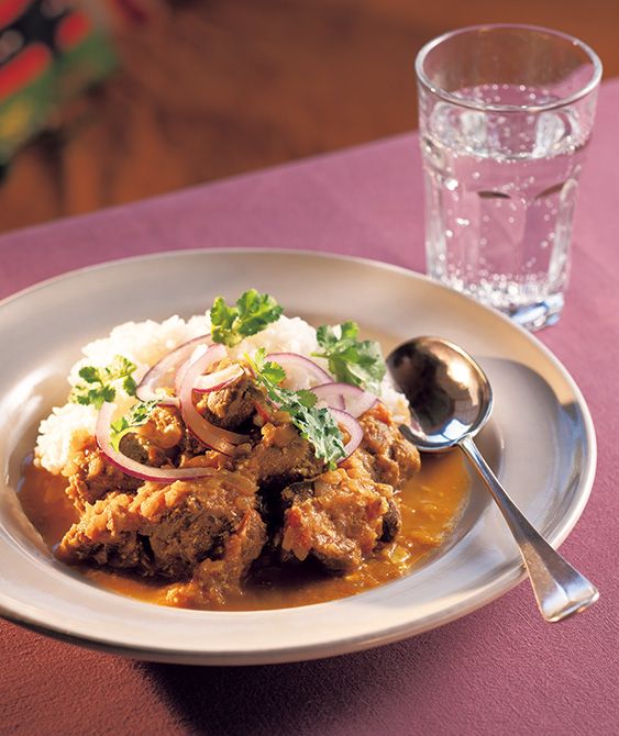 (3)Bを加えて香りが立つまで炒め、(1)の肉とかぶるくらいの煮汁を加え、プレーンヨーグルトも加える。約10分煮て塩・こしょうで味をととのえ、ご飯とともに器に盛って紫玉ねぎ、パクチーを散らす。