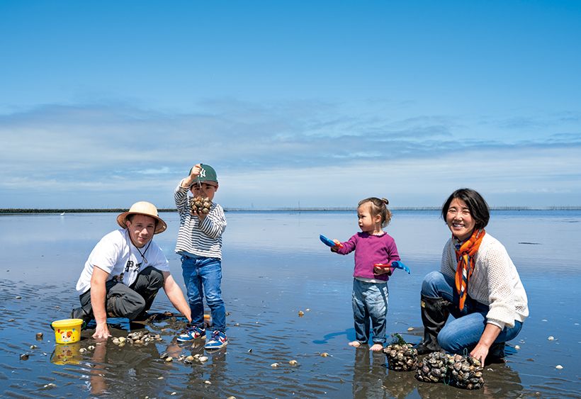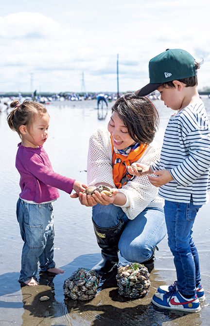 二人が採ってきた貝を見て、「表面がざらざらしてるのがあさりで、つるっとしてるのがはまぐりだよ」とさりげなく教える志麻さん。