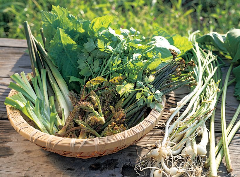 近所で摘んだ山菜。かごの外は右から、ふき、のびる。かご盛りは奥右から、わらび、三つ葉、せり、いわたばこ、みょうがたけ、やぶかんぞう、手前はたらの芽。