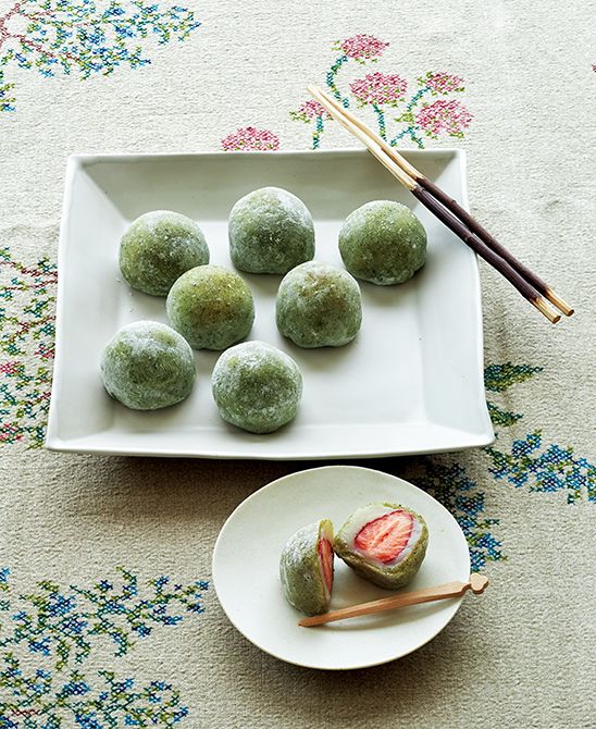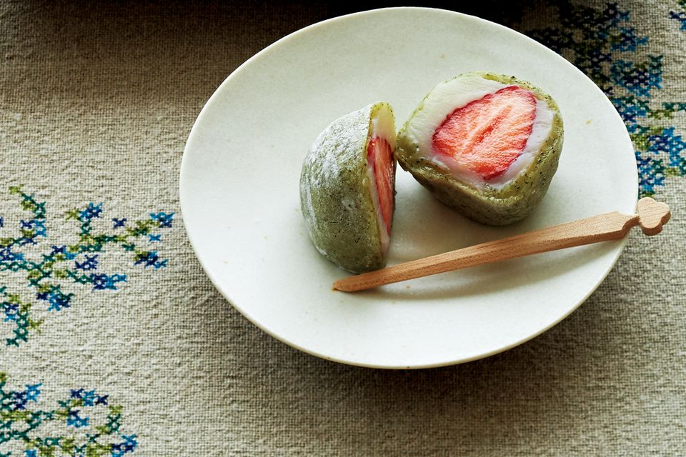 (5)白あんは1つ25グラムで8個に分け、それぞれいちごを包んで丸めておく。指に片栗粉をつけて(4)の生地をのばし、直径約8センチの円形にし、真ん中にいちごを包んだ白あんをのせて包み込み、指でつまんで閉じる。閉じ口は下にして片栗粉の上に置く。同様にして8個作る。