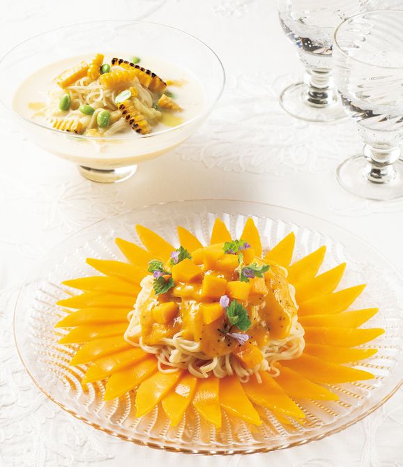 夏限定の野菜とフルーツが持つ甘みを生かしながらどう「料理」に仕立てるのか、がプロの腕の見せどころ。ポイントは塩と辛み。繊細に、ときには大胆に。長く素材と向き合ってきた熟練の技が、深い味を作り出しました。華やかなフルーツ麺、やさしい味わいのとうもろこし麺。涼やかなビジュアルは目にもご馳走です。