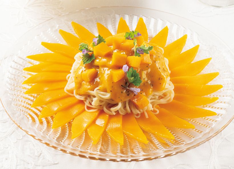 4.器の周囲に半月切りにしたマンゴーを盛る。中央に麺を盛って(2)をかけ、角切りにしたマンゴーをのせ、小さくちぎったハーブを散らす。