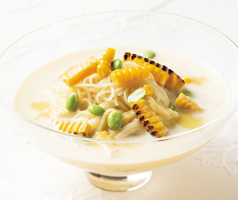 3.麺をゆでて冷水でしめ(記事末「涼麺の基本」参照)、水気をよくきる。器に盛ってとうもろこしスープを注ぎ、トッピングを色よく散らす。