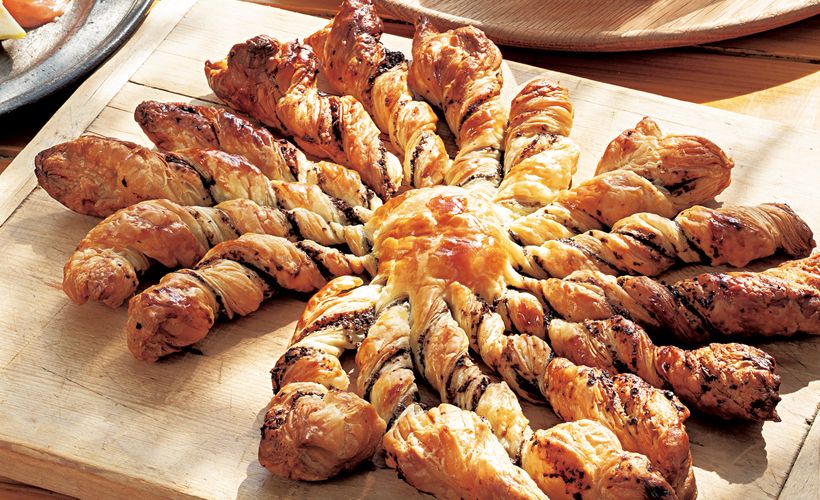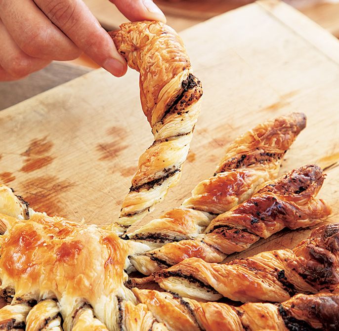 (4)(3)の切った部分を1本ずつ根元からねじる。外側にいくほど引っぱりながらねじり、ねじり終わりは下にして押しつける。表面に溶き卵を塗って約30分焼く。