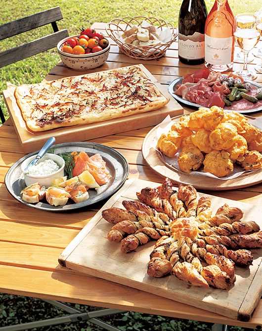 手前から時計回りに、タルトソレイユ、サーモンとチーズクリームのカナッペ、タルトフランベ、シャルキュトリー盛り合わせ、コンテとブルーチーズのグジェール。友人宅で収穫したミニトマトもアペロのお供に。