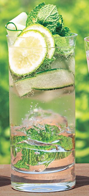 (2)きゅうりはピーラーで縦に薄くスライスし、ミント、ライムとともにグラスにギュッと詰め、(1)を大さじ4~5、炭酸水を加えて混ぜる。