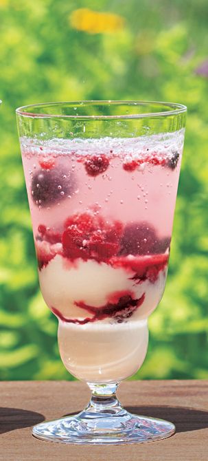 (2)グラスにヨーグルト、ベリーのマリネ各大さじ3を入れ、炭酸水適量を加える。混ぜながら飲む。