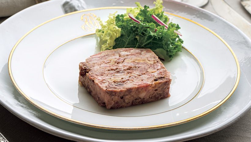 (7)洗って水気をきった葉野菜を一口大に切り、薄切りにした紫玉ねぎと合わせ、少量の酢、塩、オリーブオイルであえ、パテ・ド・カンパーニュに添える。好みで、マスタード、塩、こしょう(各材料外)を添える。