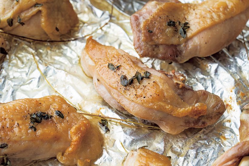 作り方 (1)鶏肉をバットに入れ、塩をよくまぶし、タイムをちぎってまぶす。ラップをして冷蔵庫に入れて1時間〜一晩おく。