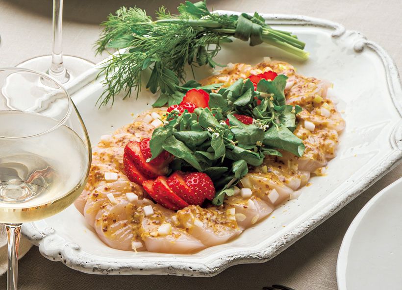 (3)帆立貝柱を2等分にし、器に並べ、(1)のソースをまんべんなくのせ、クレソンといちごも盛る。ディルとイタリアンパセリを束ね、万能ねぎで結んでハーブのブーケを作って添える。