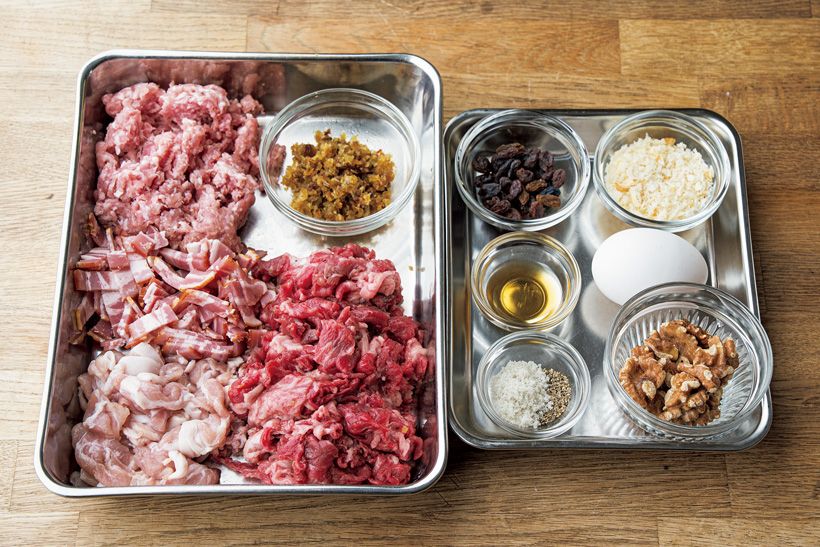 (3)(2)のボウルに豚ひき肉、卵、ブランデー、パン粉、塩、こしょうを加え、手早く全体を手で混ぜ合わせる。肉を少量、耐熱容器に入れてラップをし、電子レンジ(600ワット)で20秒ほど加熱し、味をみる。(1)と塩(分量外)が足りなければ加え、ひと混ぜしたらくるみとレーズンを入れて混ぜ合わせる。