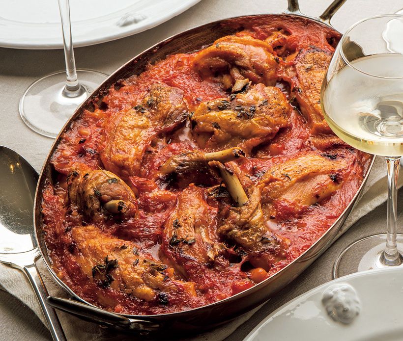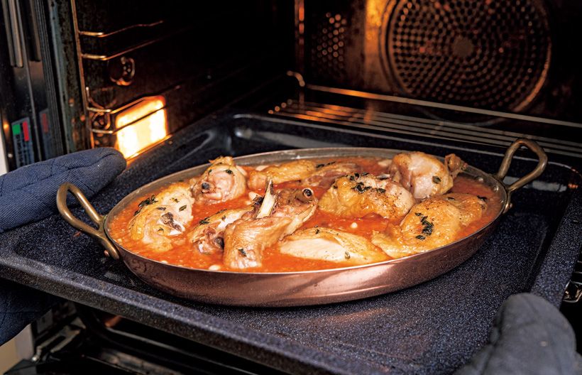 (5)(4)の上に(3)の鶏肉を皮目を上にして並べ(下写真参照)、200度のオーブンで25〜30分焼き、熱々をテーブルへ運ぶ。