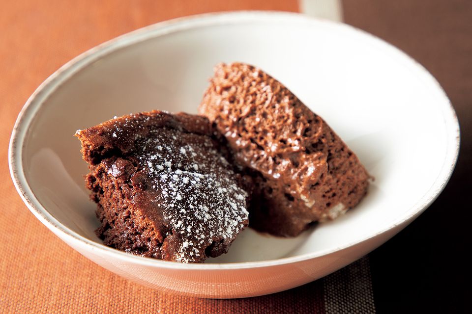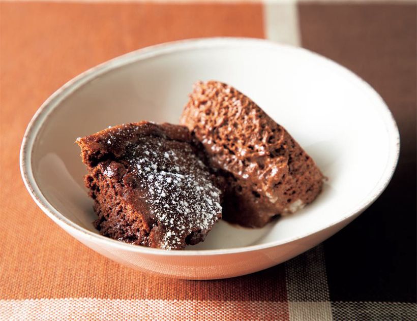 焼きチョコレートムース:オーブンを230度に予熱する。耐熱容器に(2)を入れて約10分焼く。粗熱を取って粉糖をふる。