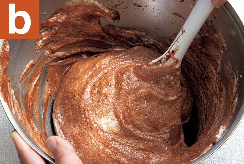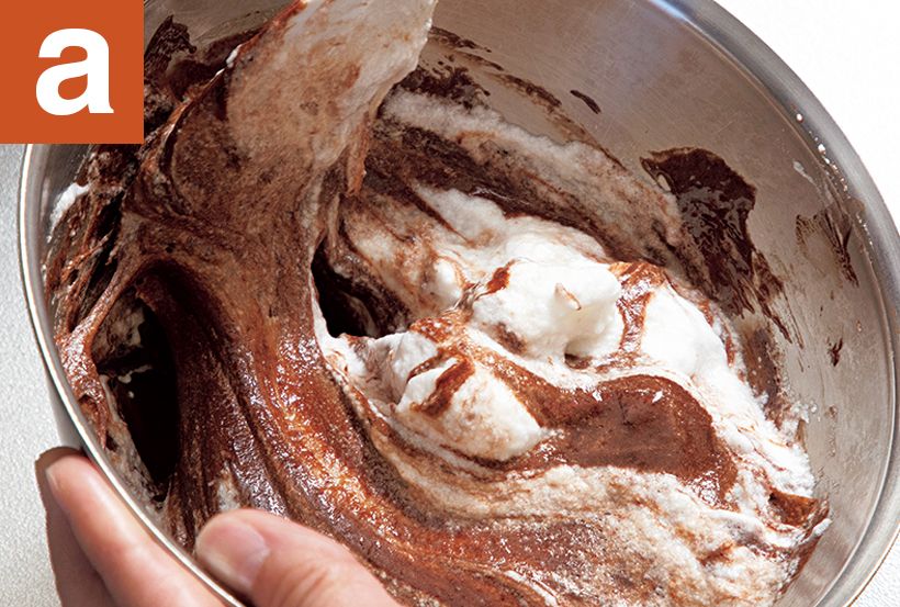 (2)(1)のチョコレートに卵黄を加えてしっかり混ぜる。卵白1/3量を加えてよく混ぜ、さらに卵白1/3量を加えて泡を消さないように大きく切るように混ぜる(a)。残りの卵白のボウルにすべて戻し入れ、ムラなく混ぜる(b)。