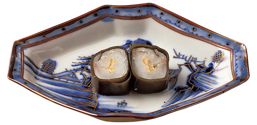 (4)しょうがを芯にして昆布に甘酢をベタベタとつけて、柔らかくしながらしっかり巻く。竹皮の紐でくくって留め、しばらくおいて、適当な厚さに切り分ける。