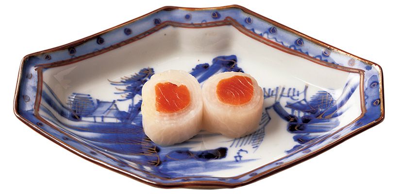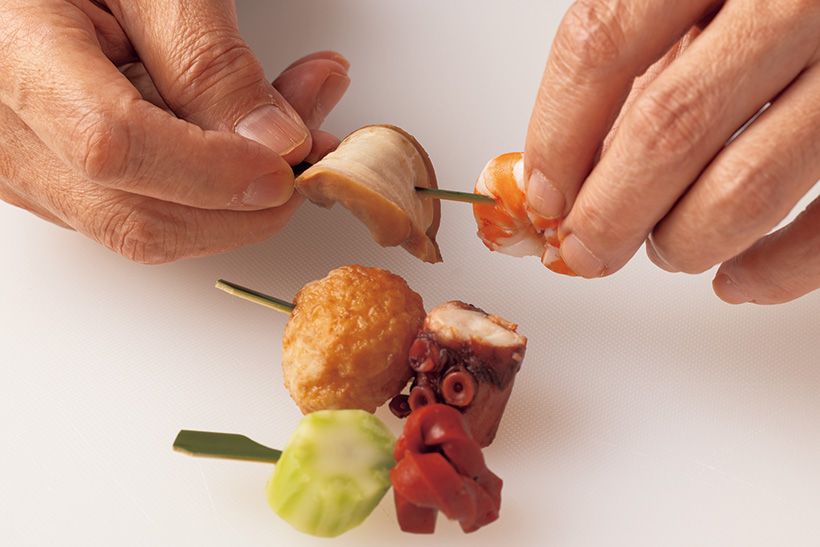 大きさを揃えて串を刺す。直径20センチの竹の器の場合、竹串の長さは6センチ、具は2種類が目安。器が大きい場合は、竹串は9センチ、具は3種類に。