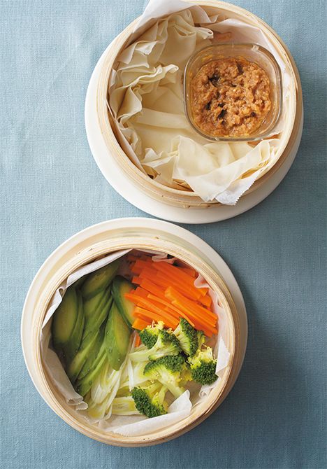 野菜を下の段、春巻きの皮と肉みそを上の段にして蒸せば、具を包んで食べる中国式春巻きが完成! “手巻き”で食べるスタイルが、ホームパーティーにもぴったりです。