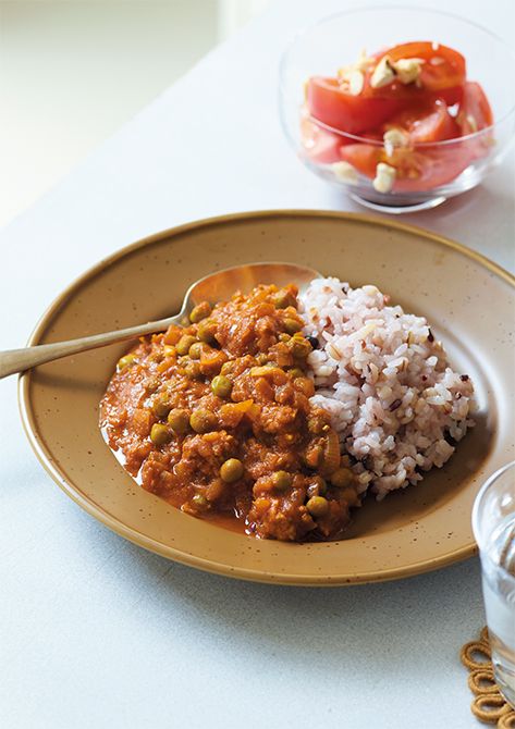 作り方(1)厚手の鍋にココナッツオイルを塗り広げ、シナモン、玉ねぎ、【A】、トマトピューレ、グリーンピース、ひき肉を順に重ね、白ワイン、カレー粉、塩をふり入れる。