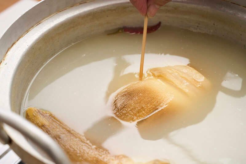 (4)深鍋に(3)、米のとぎ汁をかぶる程度に入れ、赤唐辛子を加えて落し蓋をする。中火にかけ、煮立ったら弱火にして40~50分ゆでる。