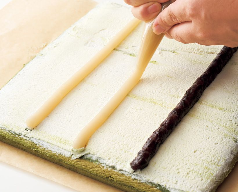 〈中身をのせる〉(10)(7)の敷き紙をはがし、焼き面を上にしてオーブンペーパーの上にのせる。(8)の抹茶カスタードクリームをカードで薄く塗り、(9)のホイップ式クリームを塗り重ねる。