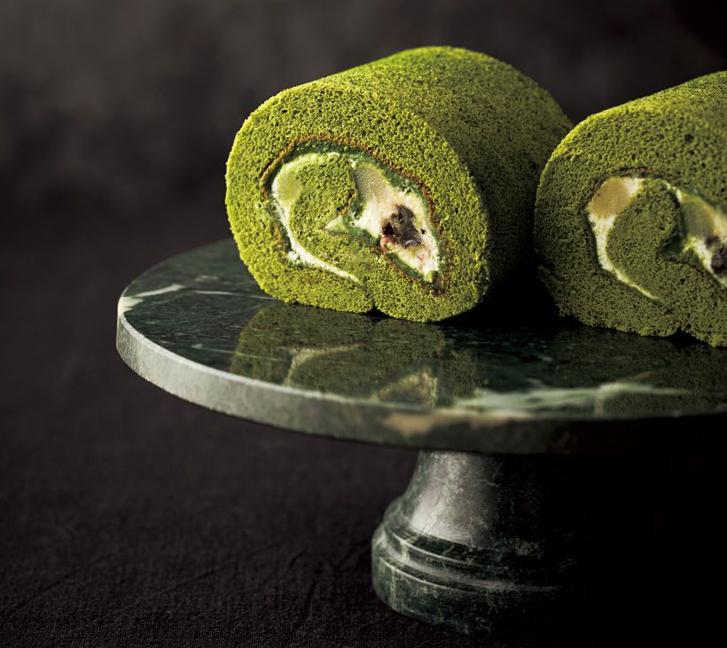 もっちり生地「抹茶ロール」:抹茶の味を濃厚に感じる生地で、抹茶入りのカスタードを巻き込んで。器には抹茶やクリームを添えて華やかに。
